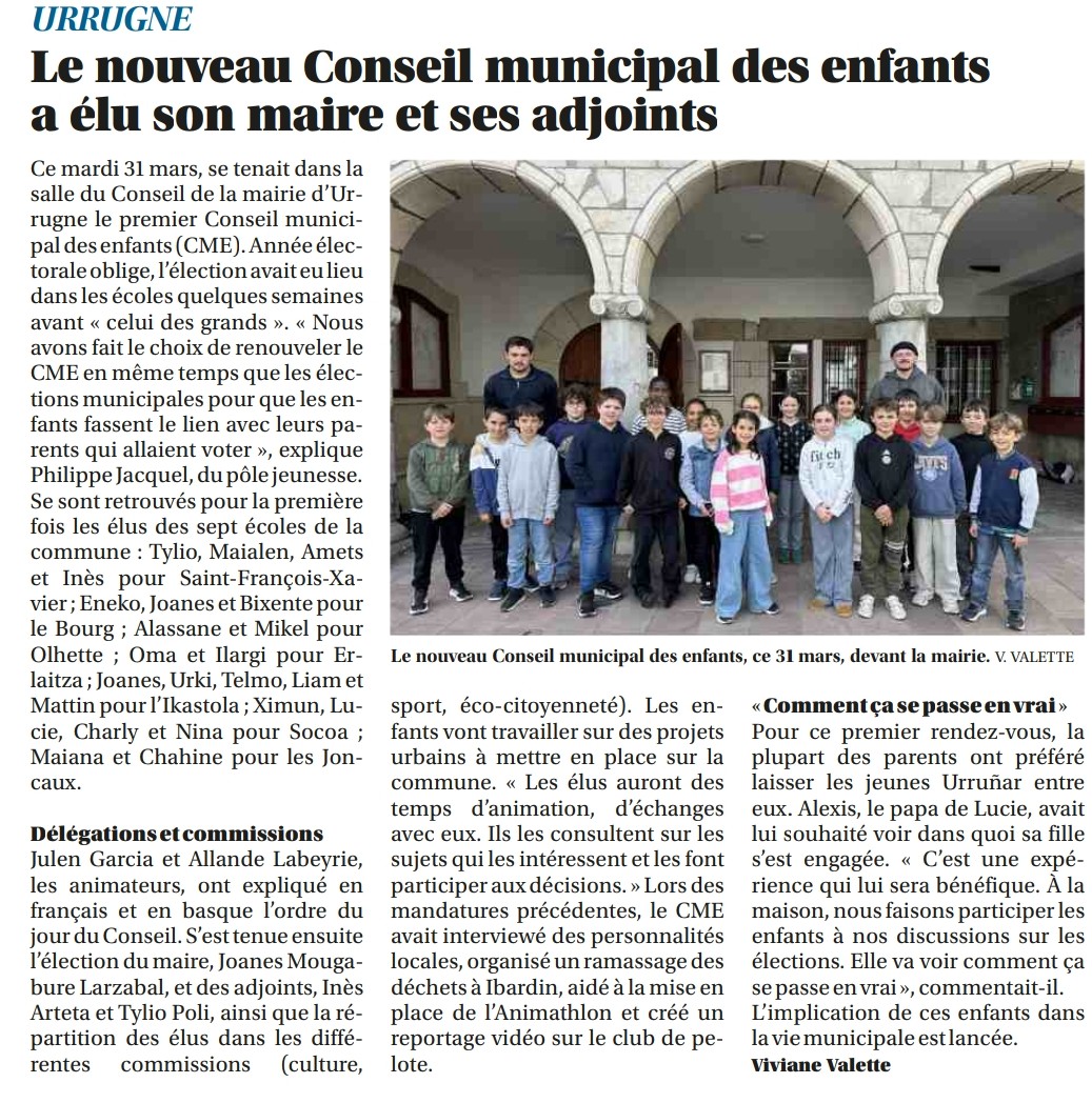 03-04-26 sud-ouest le nouveau conseil municipal des enfants a élu son maire et ses adjoints